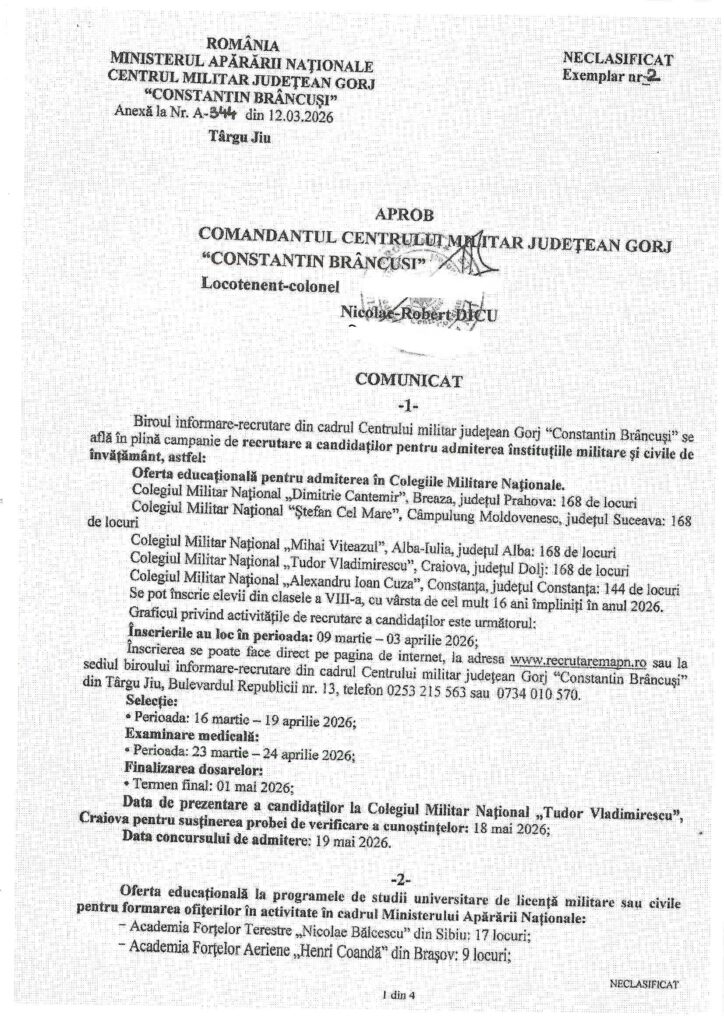 The post anunț centrul militar județean gorj first appeared on Primăria oraşului Rovinari. Source