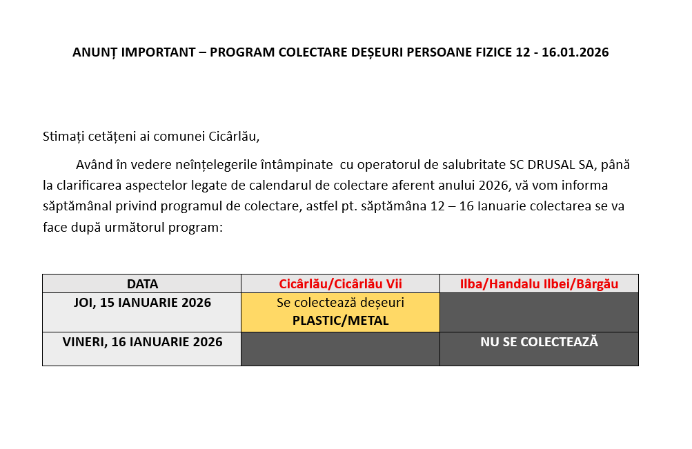 • ANUNȚ IMPORTANT – PROGRAM COLECTARE DEȘEURI PERSOANE FIZICE 12 – 16.01.2026