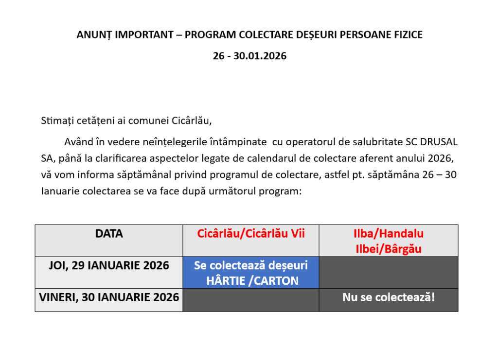 ANUNȚ IMPORTANT – PROGRAM COLECTARE DEȘEURI PERSOANE FIZICE 26 – 30.01.2026