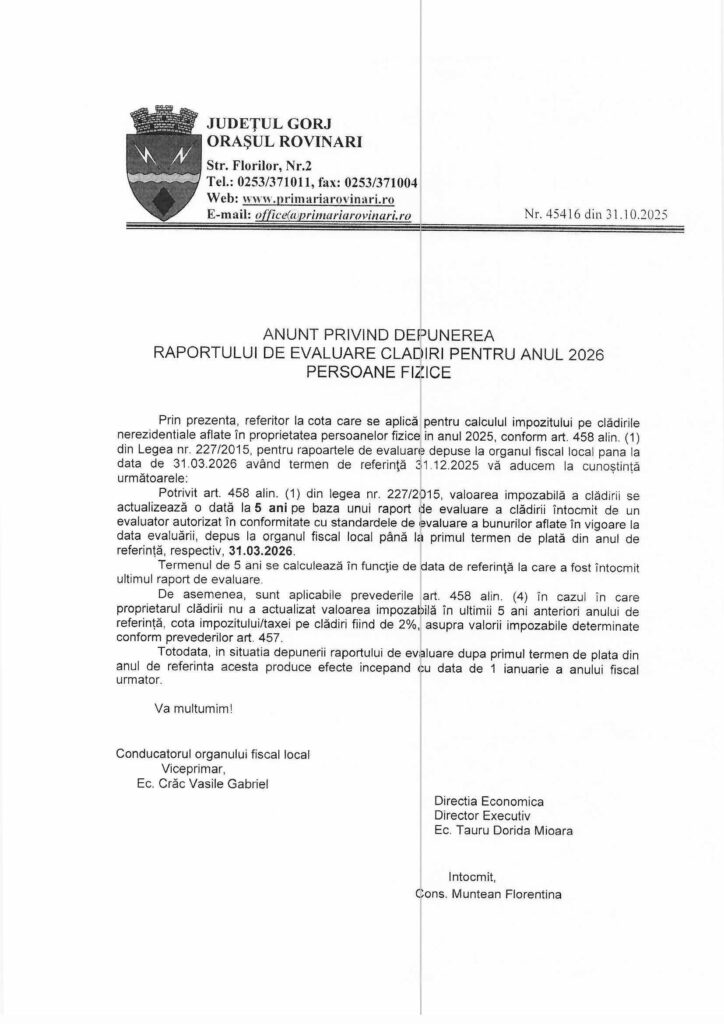 The post anunț privind depunerea raportului de evaluare clădiri pentru anul 2026 – persoane fizice first appeared on Primăria oraşului Rovinari. Source Navigare în articole Calendar colectare deșeuri menajere 2025 -2026 anunț privind depunerea raportului de evaluare clădiri pentru anul 2026 – persoane juridice