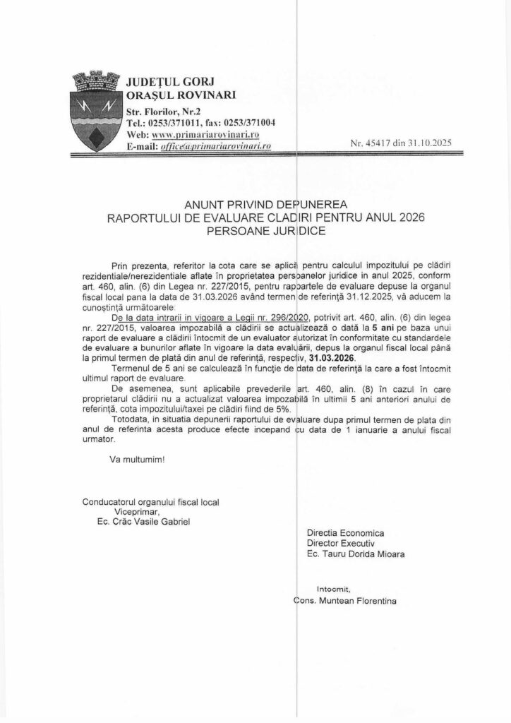 The post anunț privind depunerea raportului de evaluare clădiri pentru anul 2026 – persoane juridice first appeared on Primăria oraşului Rovinari. Source Navigare în articole anunț privind depunerea raportului de evaluare clădiri pentru anul 2026 – persoane fizice
