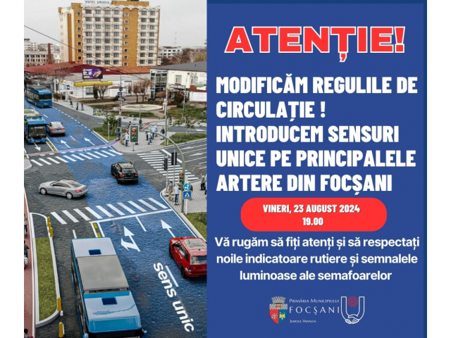✅Primăria Municipiului Focșani anunță că, începând de vineri, 23 august 2024, ora 19.00, vor fi modificate regulile de circulație și va începe introducerea sensurilor unice pe principalele artere din oraș, Bulevardul Unirii, Bulevardul Independenței, strada Cuza Vodă și strada Bucegi.