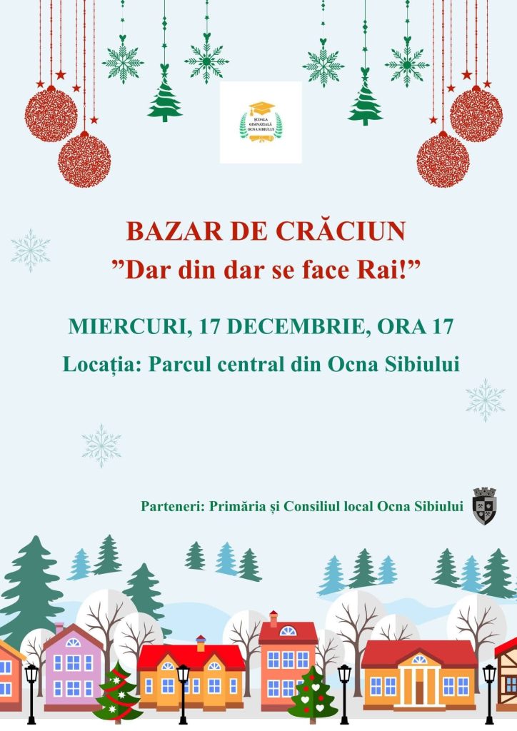 Școala Gimnazială Ocna Sibiului în parteneriat cu Primăria și Consiliul Local al Orașului Ocna Sibiului, vă invită să luați parte la bazarul de crăciun ”Dar din dar se face rai” în parcul central din orașul Ocna Sibiului,în data de 17 decembrie, ora 17:00.