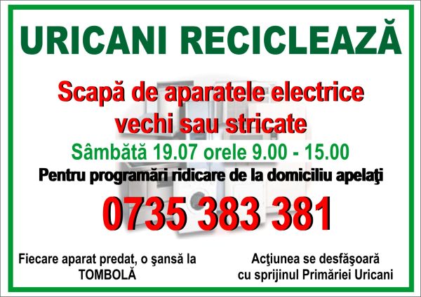 Sâmbătă 19.07.2025 – Campanie de reciclare a aparatelor electrice defecte sau stricate.