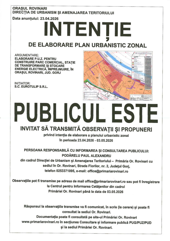 Note: There is a file embedded within this post, please visit this post to download the file.The post Consultare public – intenție de elaborare PUZ first appeared on Primăria oraşului Rovinari. Source