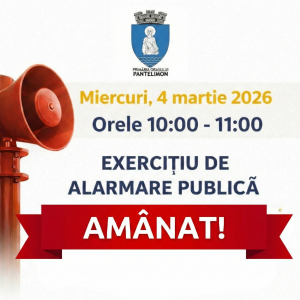 Exercițiul de alarmare publică „Miercurea Alarmelor”, programat pentru miercuri, 4 martie 2026, între orele 10:00 și 11:00, în orașul Pantelimon, se amână pentru o dată ulterioară.