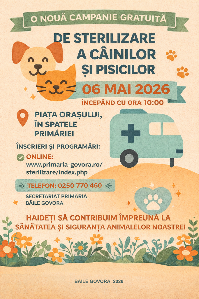 Primăria Orașului Băile Govora vă invită să participați la campania gratuită de sterilizare a câinilor și pisicilor, un demers esențial pentru sănătatea animalelor și pentru menținerea unui oraș curat și responsabil.