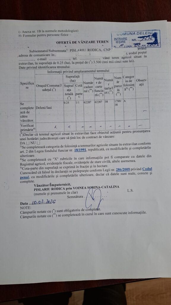 The post Oferte de vânzare terenuri – Feb 2026 first appeared on Primăria Comunei Deleni – județul Iași.
