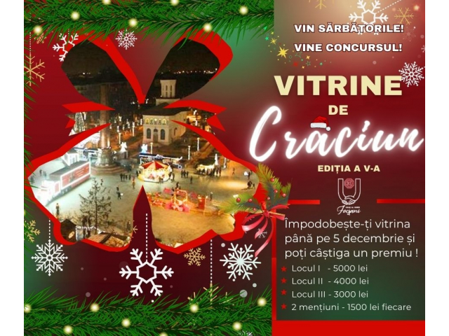 Primăria Municipiului Focșani organizează cea de-a V-a ediție a concursului public „Vitrine de Crăciun”, privind pavoazarea cu ornamente luminoase de sărbători a vitrinelor și a spațiilor din incintă, de către operatorii economici din oraș.