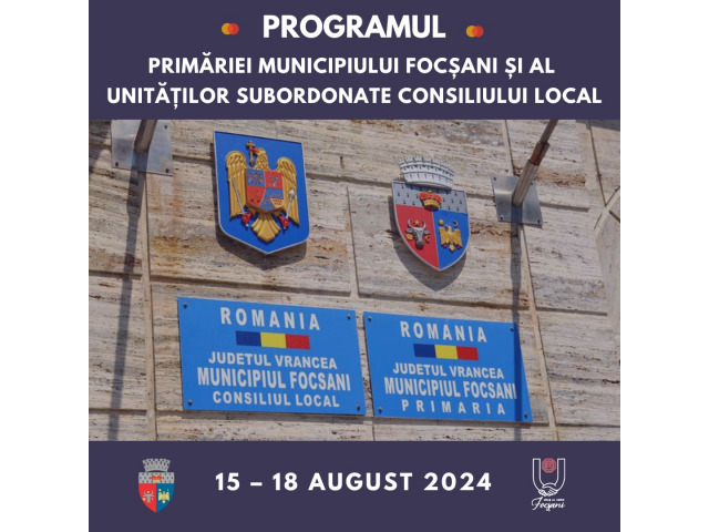 Primăria Municipului Focșani : 15 – 18.08.2024 nu se lucrează;