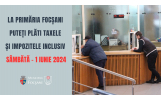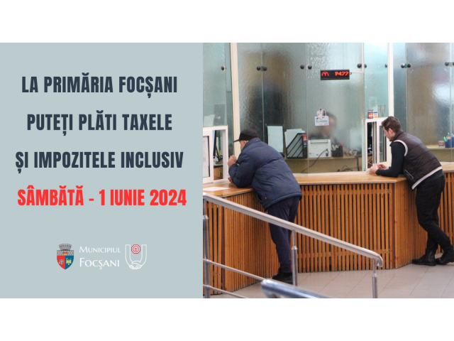 ✅Focșănenii își vor putea plăti taxele și impozitele locale la sediul Primăriei Municipiului Focșani inclusiv sâmbătă, 1 iunie 2024. Ghişeele vor fi deschise pentru cetățeni între orele 09:30 – 14:00.