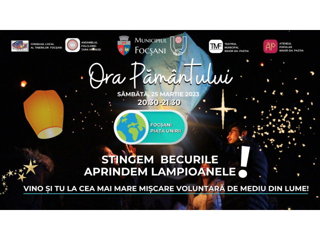 Sâmbătă, 25 martie 2023, între orele 20.30-21.30 în Piața Unirii din Municipiul Focșani va fi marcată „Ora Pământului”, cea mai mare mișcare voluntară de mediu din lume. Simultan, în peste 60 de țări, autorități locale vor opri iluminatul public între orele 20.30 și 21.30 într-o acțiune prin care ne arătăm angajamentul de a proteja planeta. În acest an, proiectul „Ora Pământului” a fost inițiat de Consiliul Local al Tinerilor din Focșani și este finanțat de Primăria și Consiliul Local al Municipiului Focșani. Vom lansa 1100 de lampioane biodegradabile în Piața Unirii dar și la Căminul pentru Persoane Vârstnice.