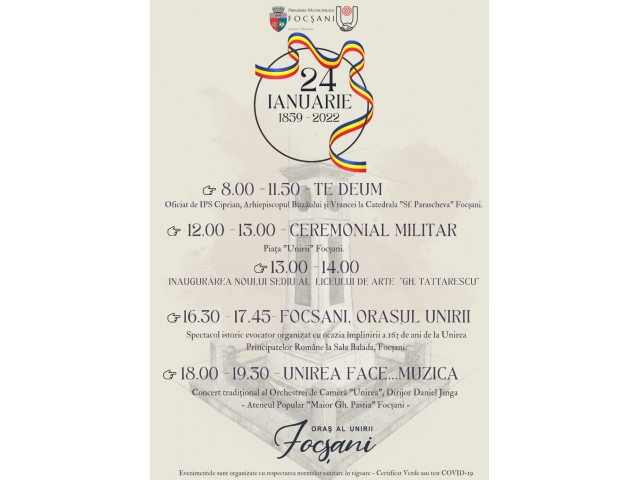Pe parcursul întregii zile, Primăria Municipiului Focșani și instituțiile de cultură din subordine au pregătit momente cultural-artistice menite să evoce, așa cum facem an de an, însemnătatea zilei de 24 Ianuarie 1859.